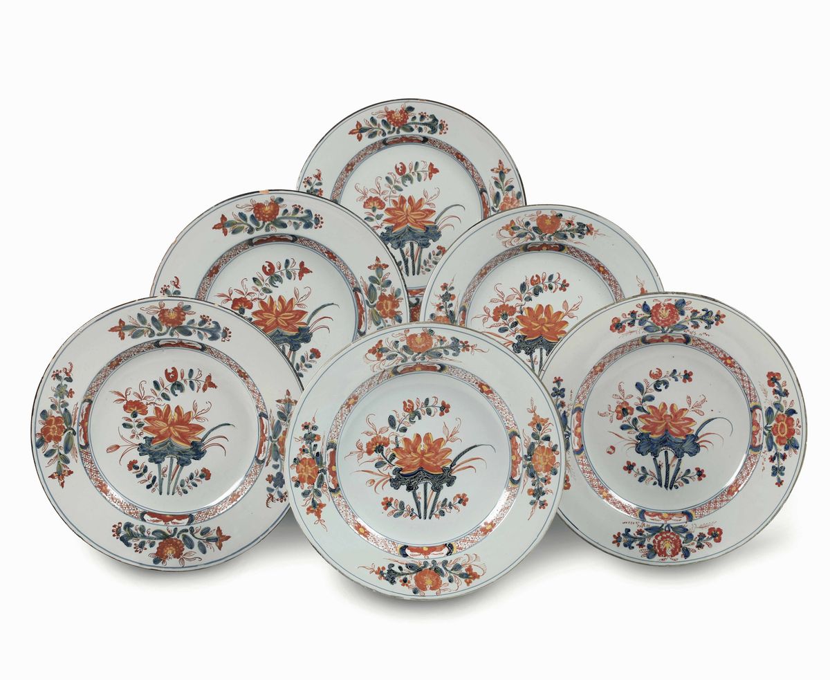Un set di raffinati piatti “a fior di loto” della Fabbrica Ferniani di Faenza Sei piatti Faenza, Fabbrica Ferniani, seconda metà del '700