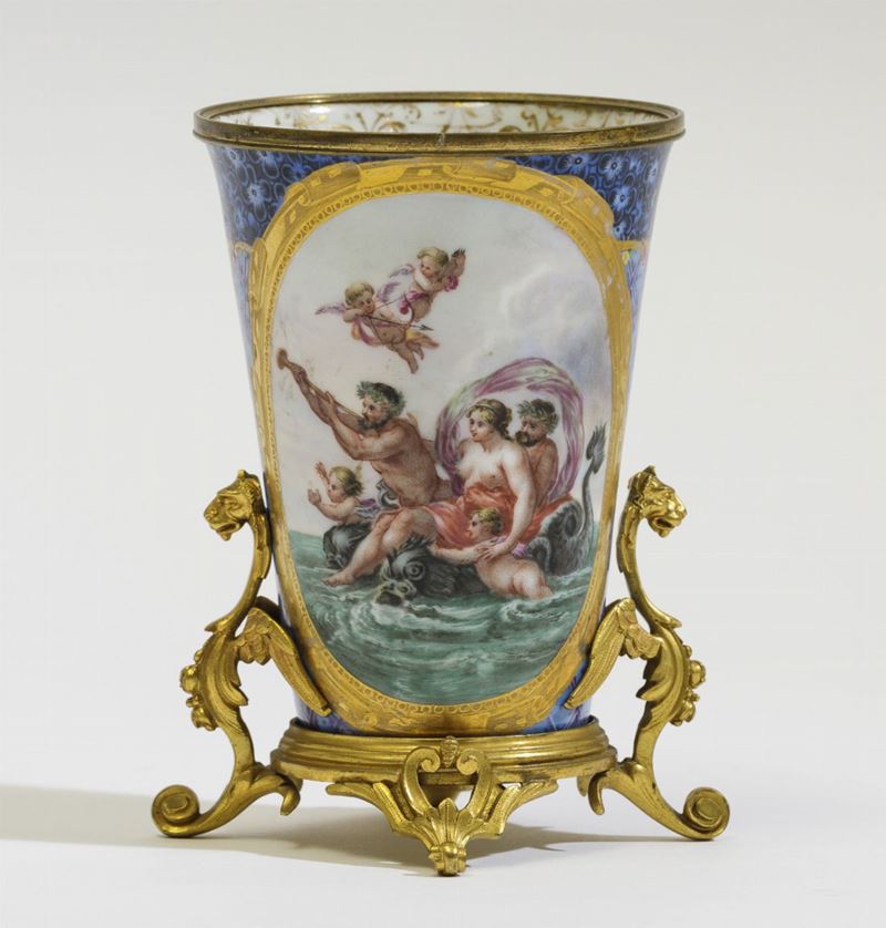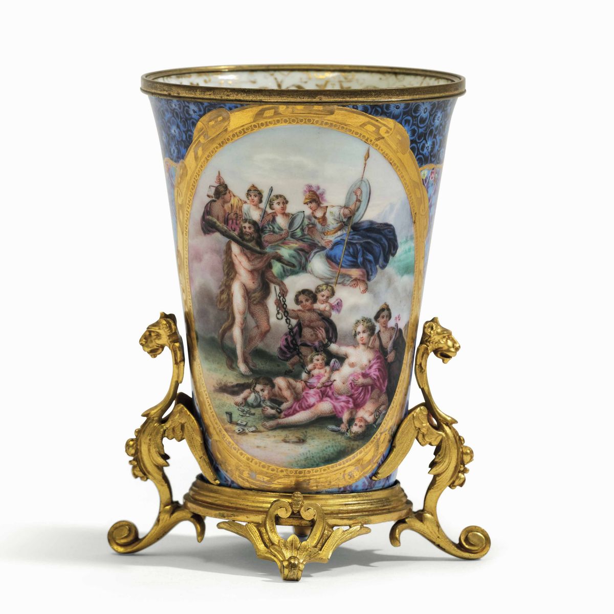Il vasetto dalla forma troncoconica è decorato con due medaglioni che racchiudono scene mitologiche con molti personaggi. Uno ospita il “Trionfo di Galatea” sull’altro troviamo narrati episodi che riguardano Ercole con sullo sfondo, tra le nuvole, raffigurati quattro personaggi a simboleggiare le quattro virtù: la prudenza, la giustizia, la fortezza, la temperanza. Il resto della superficie è a motivi geometrici e vegetali con predominanza dei toni blu. La nostra porcellana è montata su una fine base in bronzo dorato con due teste di leone alate che la trattengono