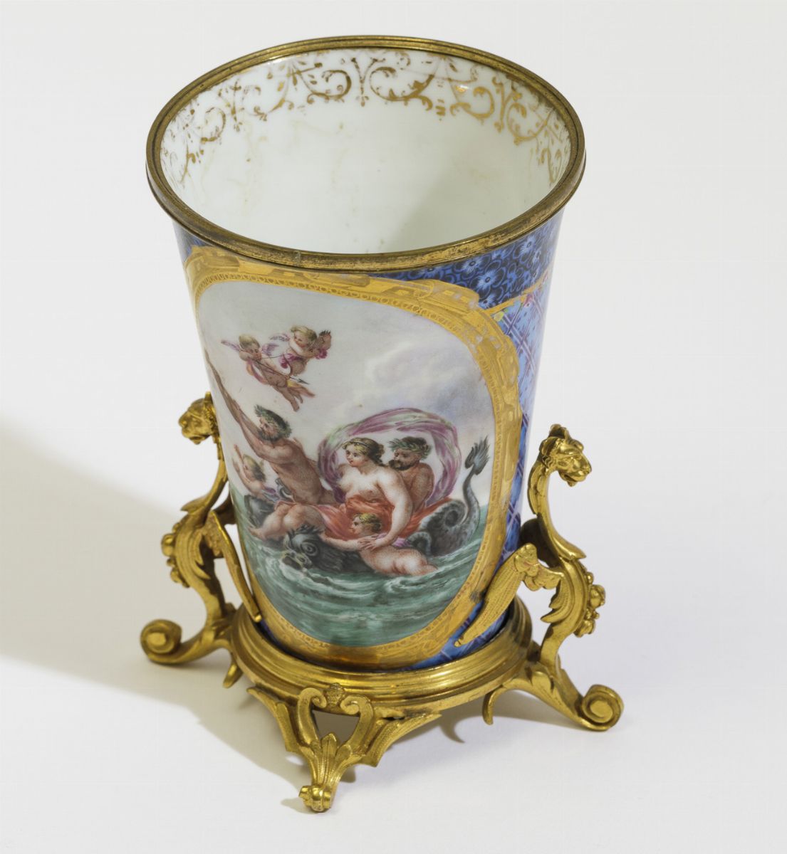Porcellana. Marca: spade in blu. Altezza cm 10,3; altezza totale cm 12,2. Conservazione: ottima; leggere usure all’oro, in particolare al bordo interno. Base in bronzo dorato