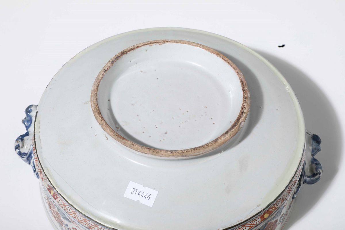 Siamo in presenza di una zuppiera di rara foggia cilindrica, della quale si conosce soltanto un altro caso simile, in collezione privata, con minime varianti decorative ma di diametro della metà. Anche questa tipologia di zuppiera propone una forma di raccolta eleganza, che raccorda con il tema decorativo esotico e che presso la Ferniani veniva proposto anche su tipiche zuppiere ovali di minori dimensioni, un po’ più slanciate specie per le prese a voluta più aggettanti e per i piedini alti e arricciati a unghia leonina1. L’opera esprime appieno i tratti di una produzione di notevole qualità tecnica ed esecutiva, comprese le particolarità cromatiche e la natura perlacea dello smalto tendente all’azzurrino, quasi a emulare la porcellana da cui trae ispirazione.