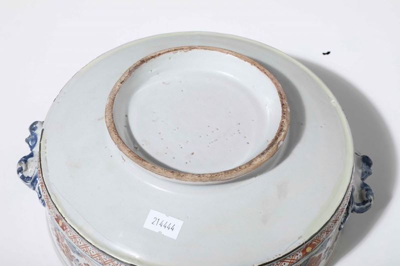 Maiolica. Altezza cm 18; diametro max. 25. Conservazione: coperchio in perfetto stato; bacinella rotta in tre frammenti e ricomposta in vecchio restauro