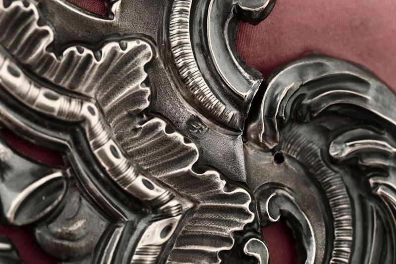 Acquasantiera in argento sbalzato e cesellato, Genova, XVIII secolo. Bollo della Torretta senza datario.