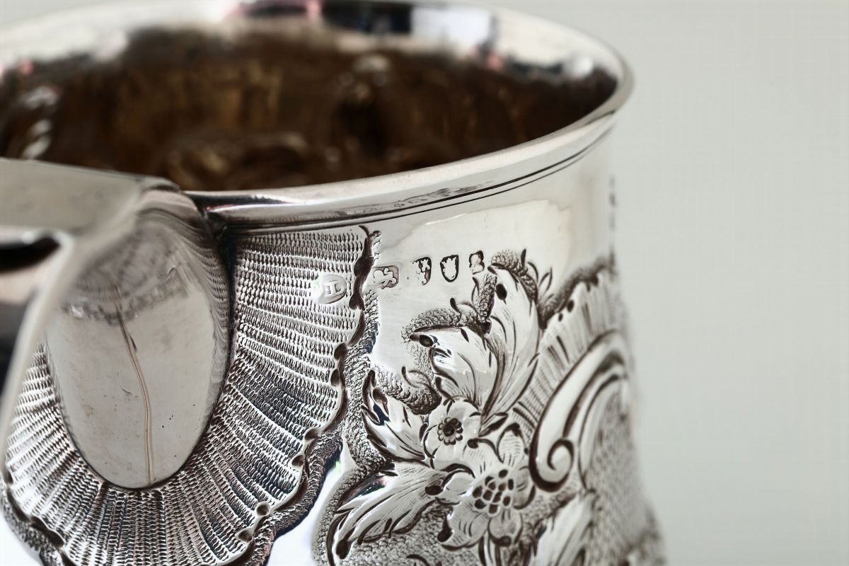 Boccale in argento, Newcastle, 1801, orafo Dorothy Langlands, marchio DL replicato sul manico