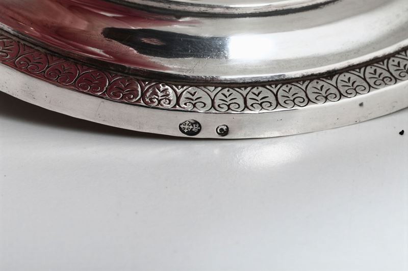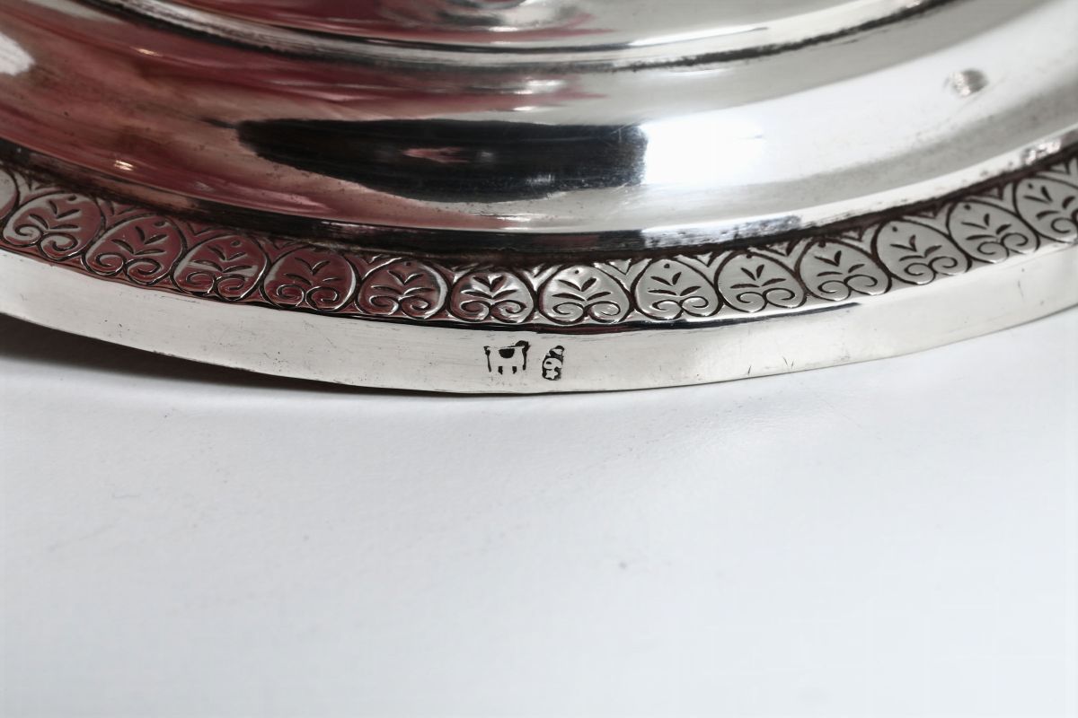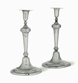 Coppia di candelieri in argento sbalzato e cesellato, Genova, metà del XIX secolo. Marchio di garanzia per i grossi lavori, bollo territoriale della città , marchio della Torretta senza datario e altro non identificato.