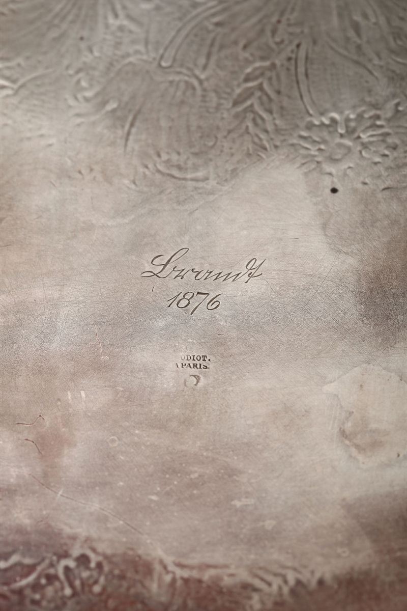 Corpo rettangolare con prese e bordo sagomati e decorati con motivi fogliacei e floreali. Piatto inciso con decori a bouquet e volute. Sul retro incisione con data 1876