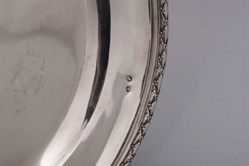 LOTTO RITIRATO Coppia di piatti in argento sbalzato e cesellato, Genova punzoni di titolo in uso dal 1805 al 1809