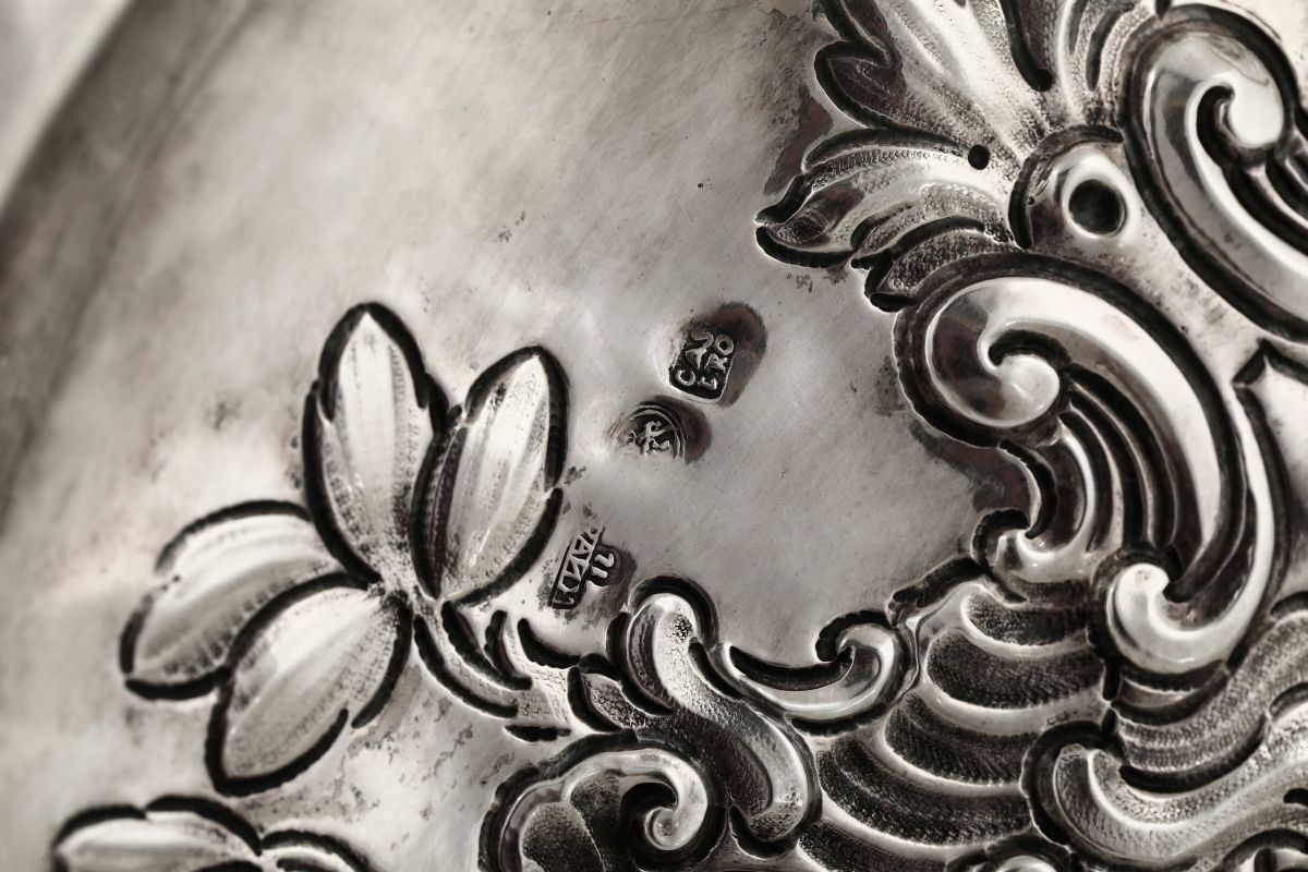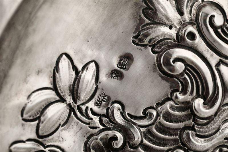 Piatto da parata in argento sbalzato e cesellato. Spagna o Colonie XVIII secolo
