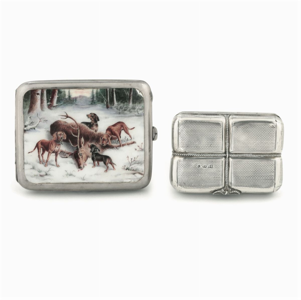 Portasigarette e tabacchiera in argento fuso, sbalzato, cesellato e smaltato. Russia XIX-XX secolo.
