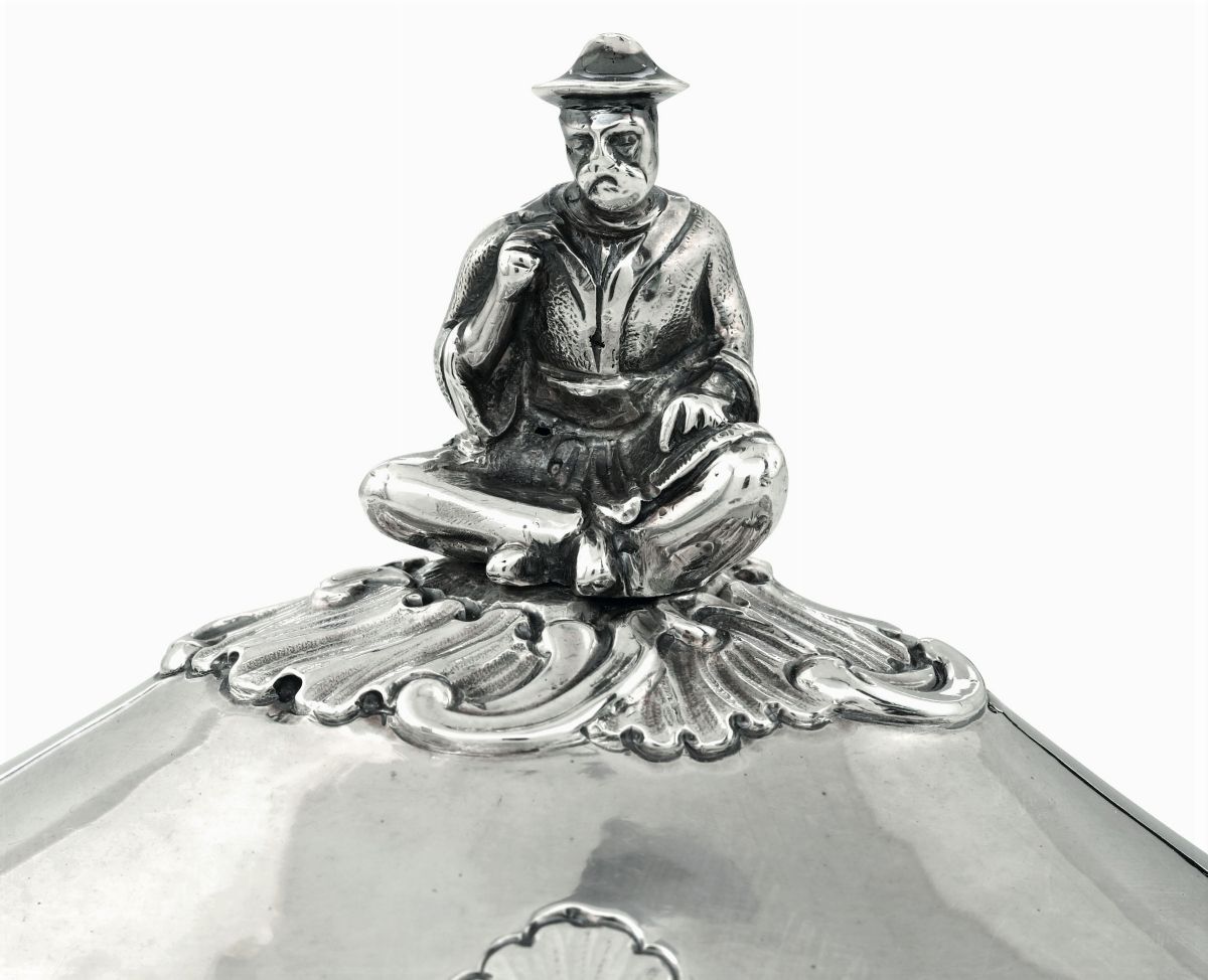 Corpo ovale liscio con cartigli ai lati, poggiante su quattro piedi a foglia. Coperchio con cartigli sormontato da cinese seduto su rocaille sbalzata.