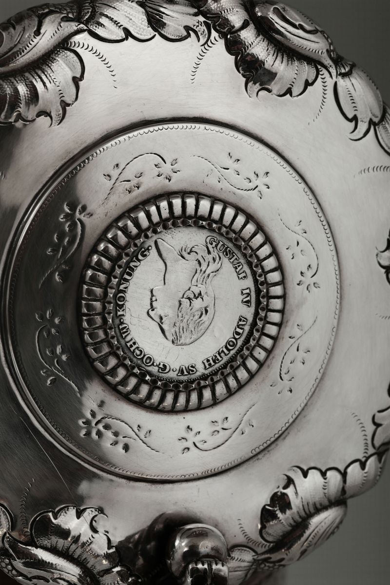 Corpo cilindrico con ricche decorazioni floreali a rilievo e figure leonine sedute. Sul fondo entro riserva circolare effige di Gustavo IV