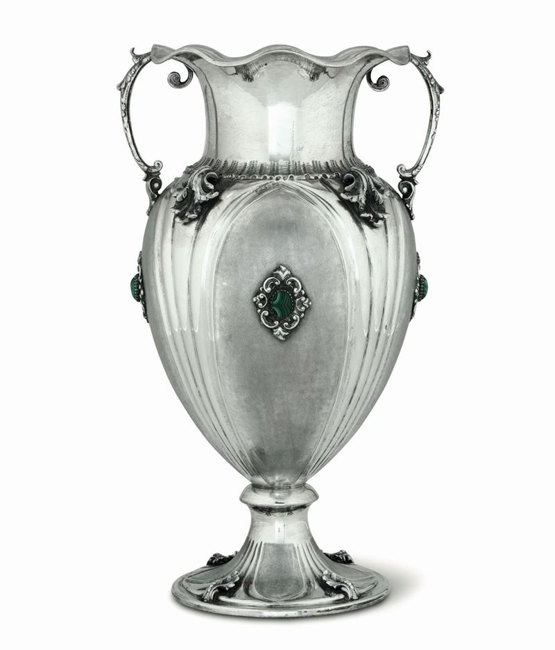Corpo allungato con riserve e nervature terminante con ampia bocca sagomata. Corte anse laterali e castoni applicati con inserti in malachite
