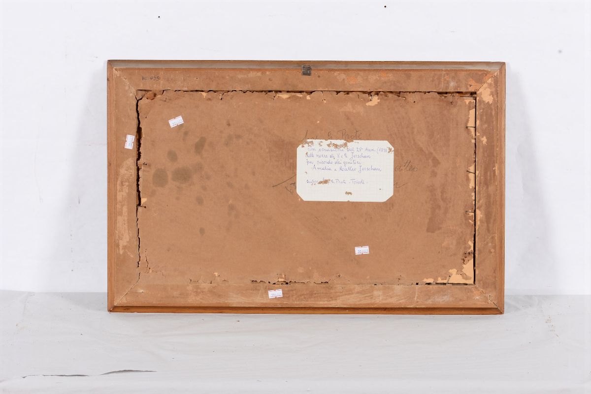 china e acquerello su carta cm 29x51. Firmato in basso a sinistra “G.Protti (un ancora girata sul fianco sinistro)” sul verso a matita “Cap.no G. Proti” sovrapposto un foglietto più recente a penna su carta quadrettata “In occasione del 25o Anniv. (1898)/ delle nozze di:/ V. e G. Jerschau/ per ricordo dei genitori/ Amalia e Matteo Jerschau/ Autore: Cap. G.Proti-Trieste”