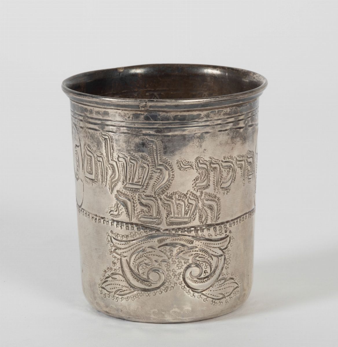 Coppa del Kiddusch in argento sbalzato e cesellato. Probabile XVIII secolo, apparentemente privo di punzonatura