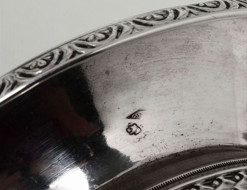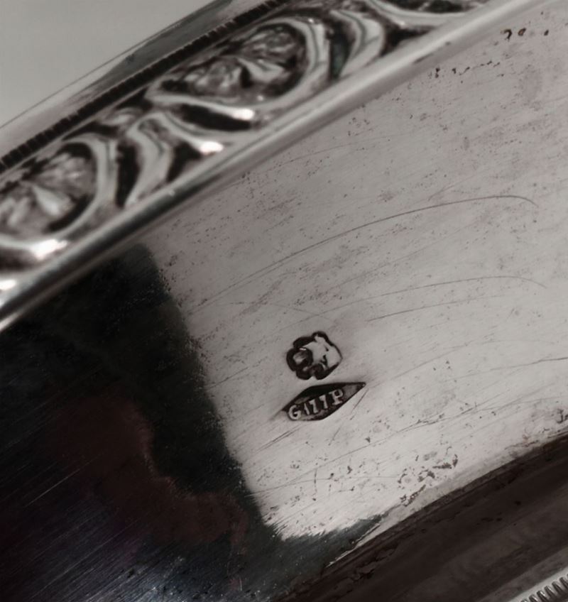 Coppia di saliere in argento fuso, sbalzato e cesellato, Torino, XIX secolo. Marchio di garanzia utilizzato dal verificatore dell’Ufficio del Marchio di Torino, impresso dal 10 ottobre 1829 al 31 maggio 1873 e altro marchio non identificato.