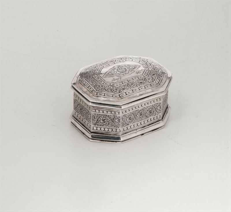 Scatola in argento fuso, sbalzato e cesellato. Arte orientale (India?) XX secolo