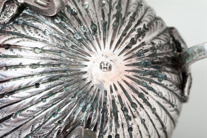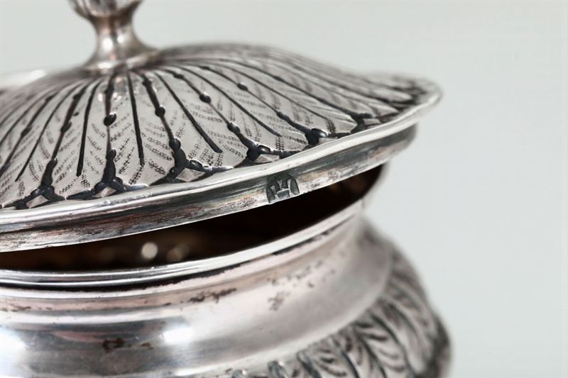 Zuccheriera in argento fuso, sbalzato e cesellato, Genova, in stile del del XVIII secolo, bollo della Torretta senza datario.