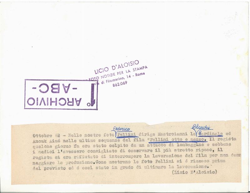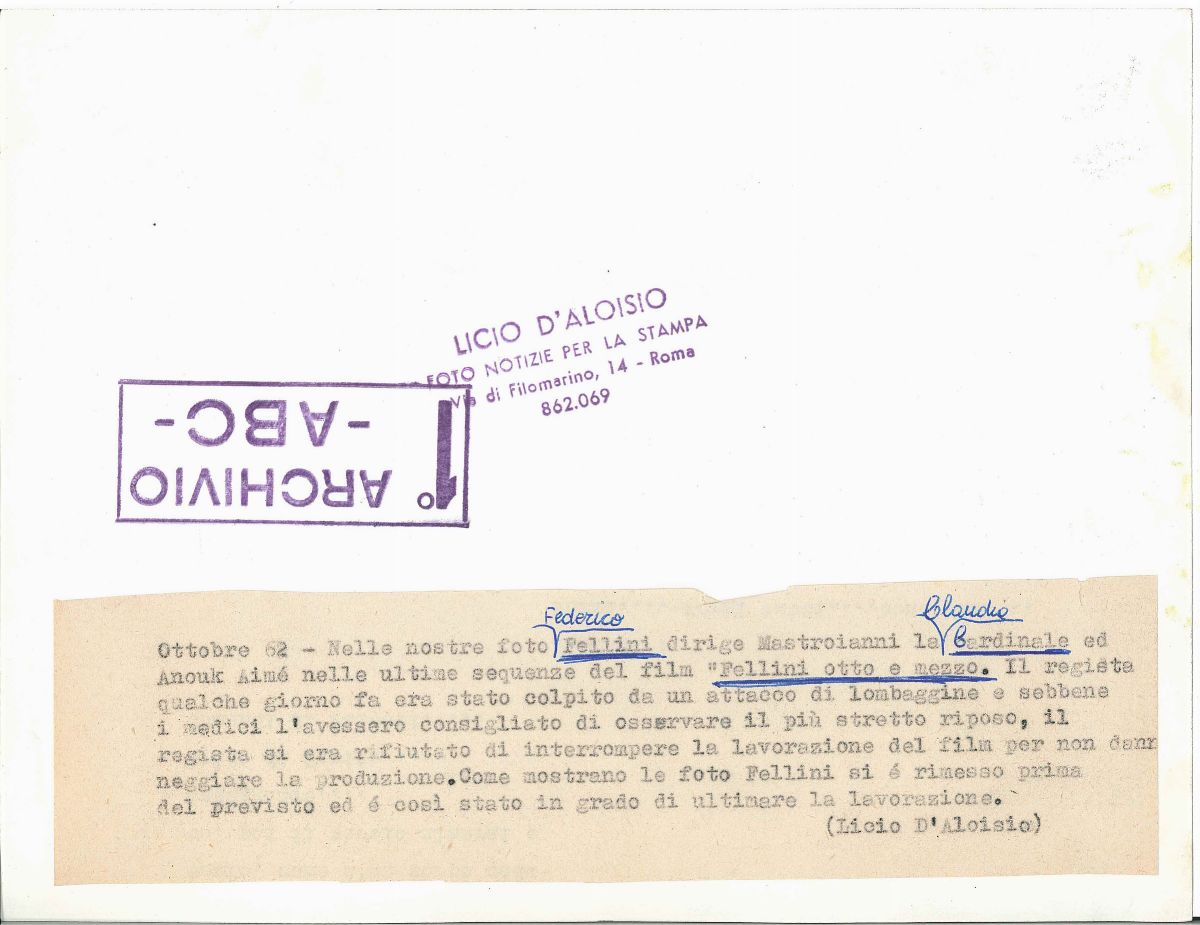 Licio D’Aloisio Federico Fellini e Claudia Cardinale, film 8½, ottobre 1962