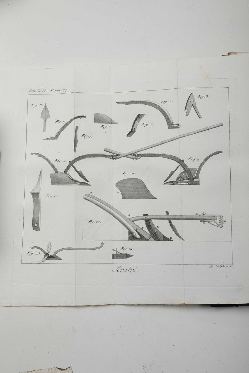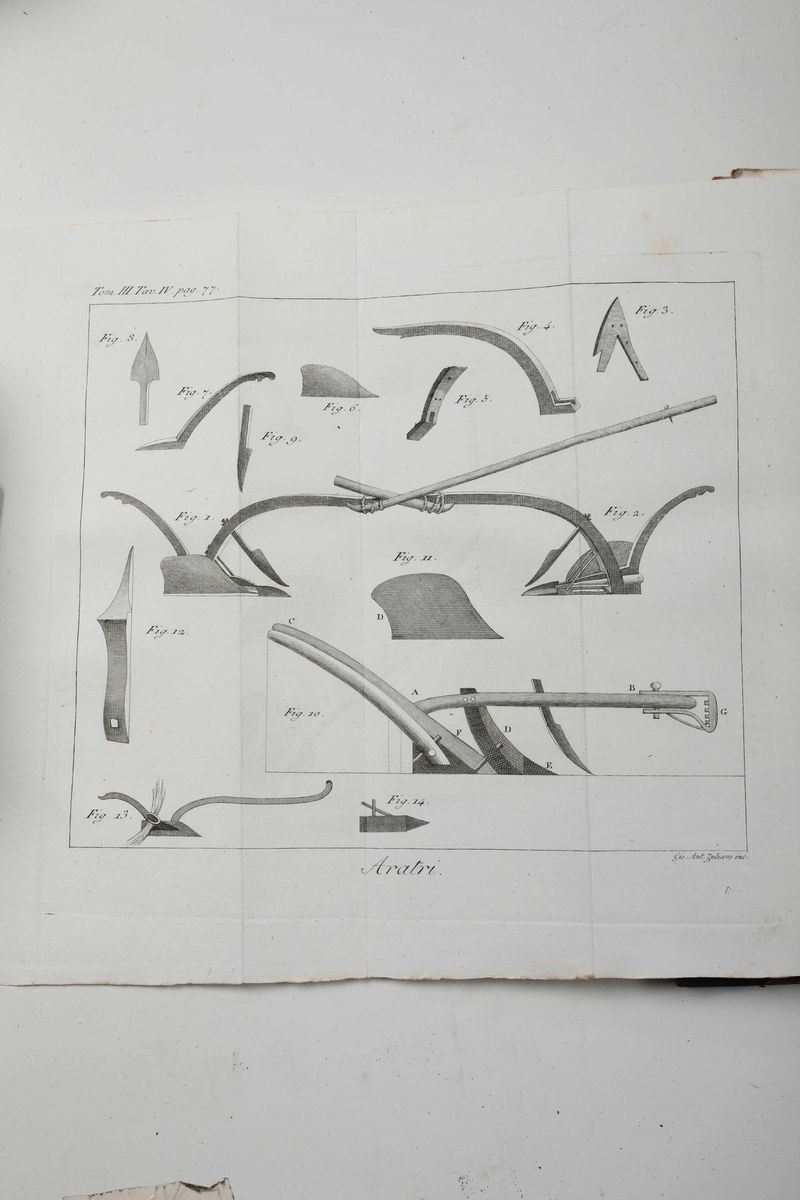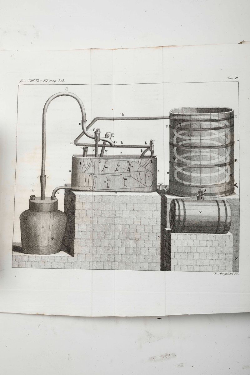 In-8°. Ventisei volumi costituiscono il corpus principale, al quale vanno aggiunti 4 volumi di supplimento. Legature coeve in mezza pelle e punte. Abrasioni ai dorsi e mancanza alla cuffia del volume quattordicesimo. Alcuni fori di tarlo, non deturpanti. Buon esemplare in barbe, adorno di tavole incise in rame.