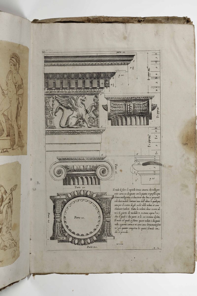 In-4°. Legatura coeva in piena pergamena con porzioni mancanti e difetti. Frontespizio e 42 tavole incise a piena pagina. Esemplare di studio, dove sono state applicate diverse figure al verso di alcune tavole. Macchia che riguarda il margine esterno alle prime 20 carte, lontano dalla parte incisa.
