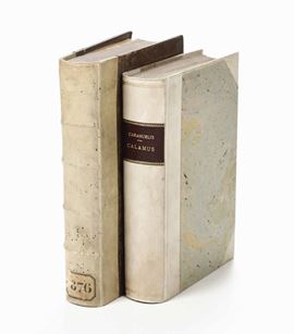 In-folio. Legature in mezza pergamena antica al primo volume, del secolo XIX per il secondo volume. Opera composta da due edizioni differenti. Al primo volume è presente ex libris a timbro della Biblioteca Nazionale Vittorio Emanuele con timbro di duplicato alienato. Esemplari uniformemente bruniti. Difetti e restauri di antica mano.