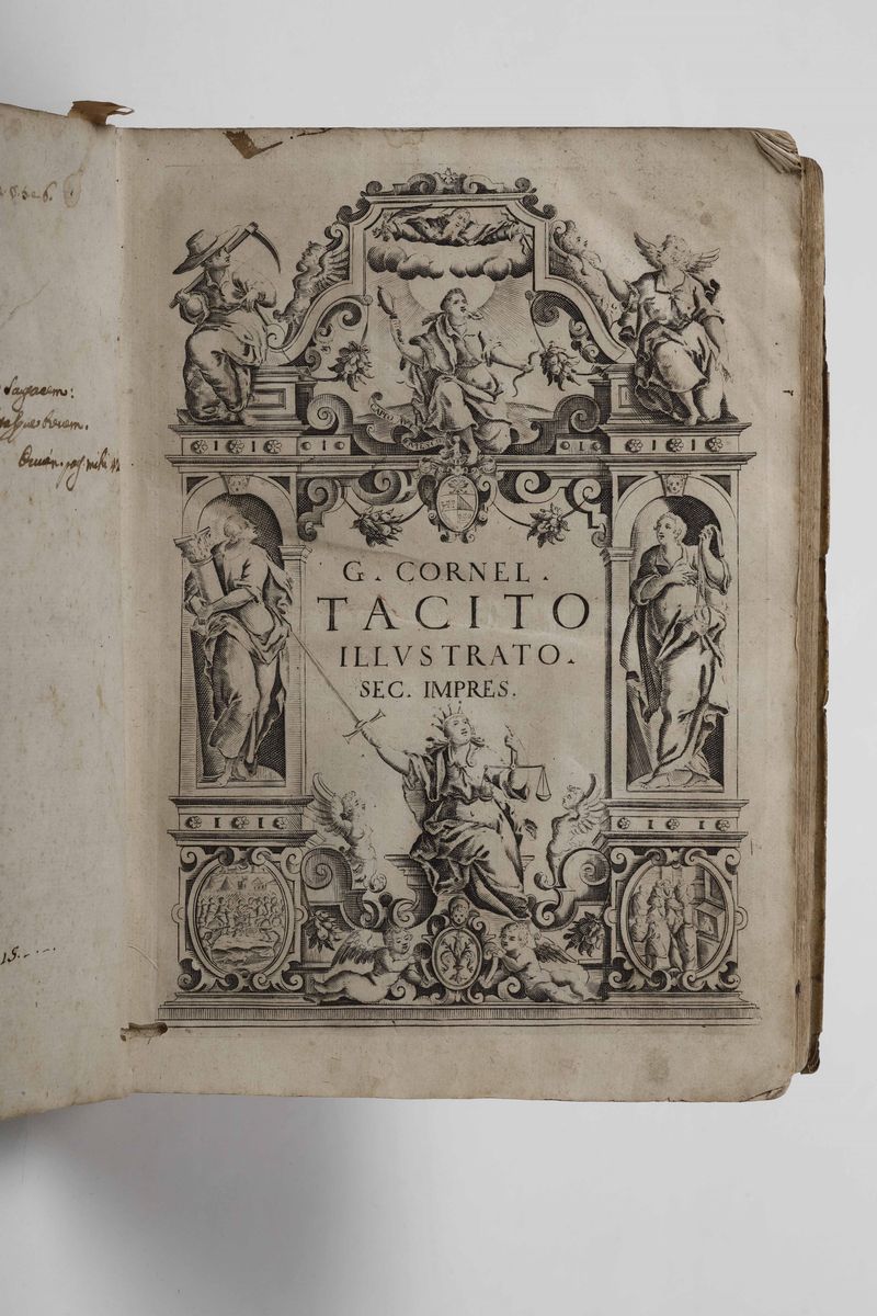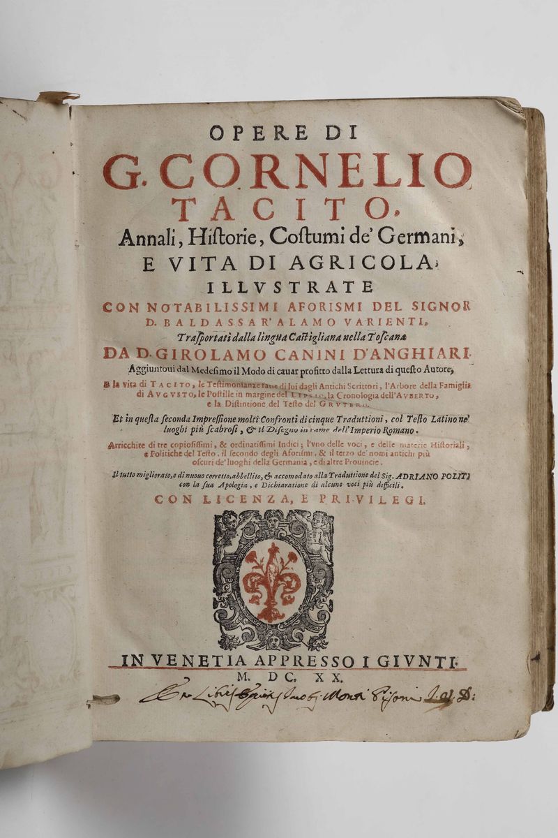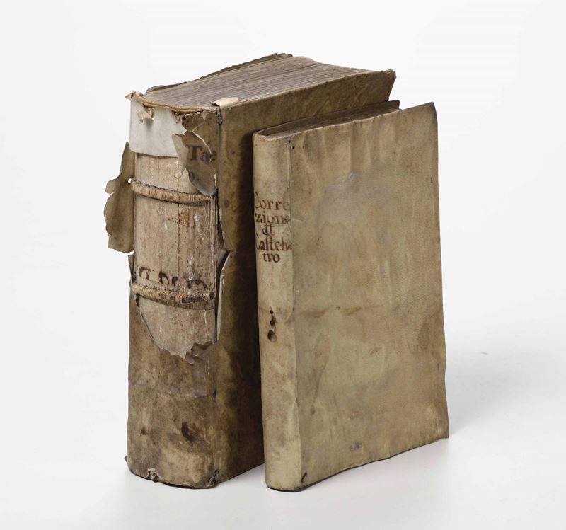 In-4°. Legatura in piena pergamena coeva. (Si unisce al lotto): Opere di Cornelio Tacito...In Venetia, Appresso i Giunti, 1620. In-4°. Legatura in piena pergamena coeva con mancanza al dorso. Bruniture e altri difetti.