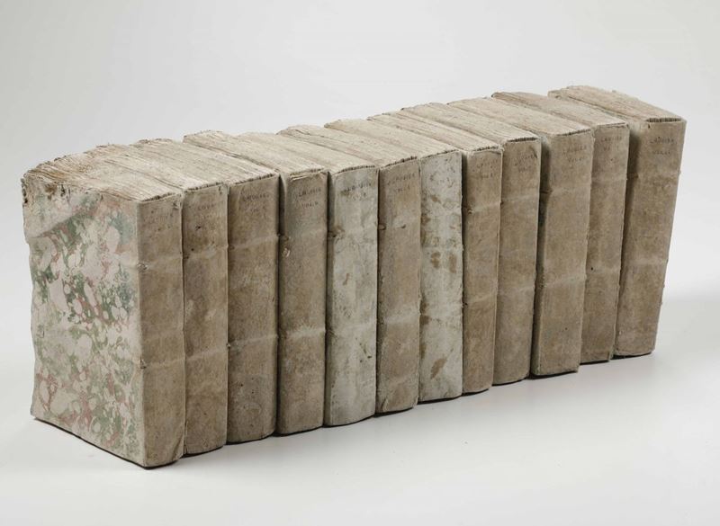 In-8°. Cartoncino marmorizzato coevo, scolorito ai dorsi. Esemplare bello e in barbe. Frontespizio del primo tomo in rosso e nero con antiporta allegorica incisa dallo Zucchi, su disegno di Novelli.