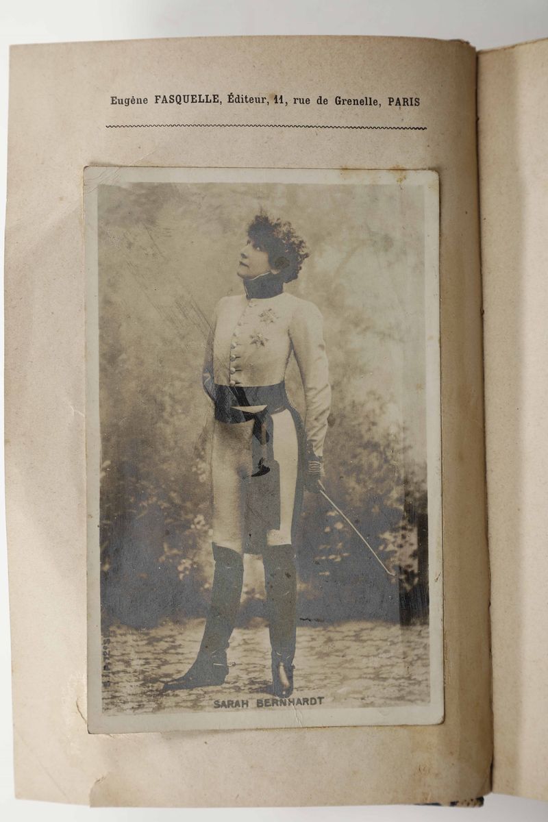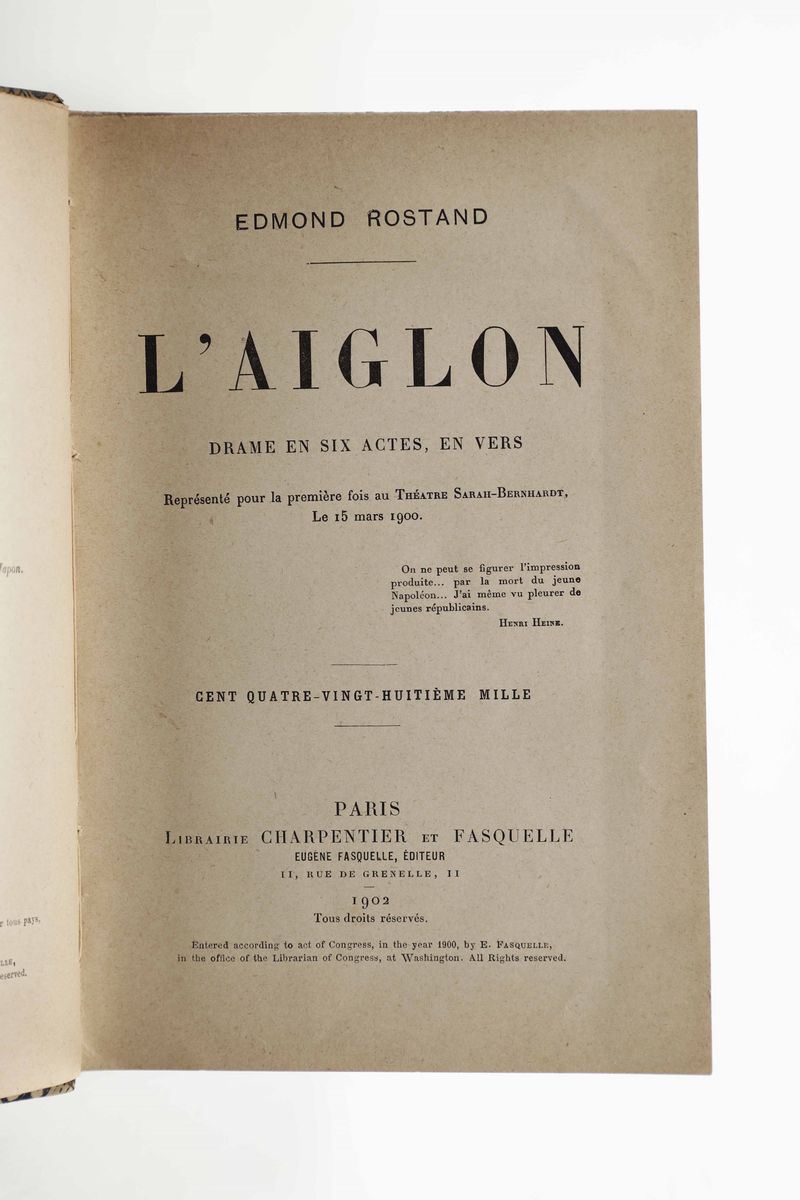 In-16°. Legatura in mezza pelle. Prima edizione,ottavo migliaio. Ex libris manoscritto alla sguardia e al frontespizio.(Si unisce nel lotto:) Rostand,Edmond. L'Aiglon..Paris,Charpertier, 1902. Con applicata alla prima carta una fotografia di Sarah Bernhardt, in costume di scena. Fioriture e bruniture.