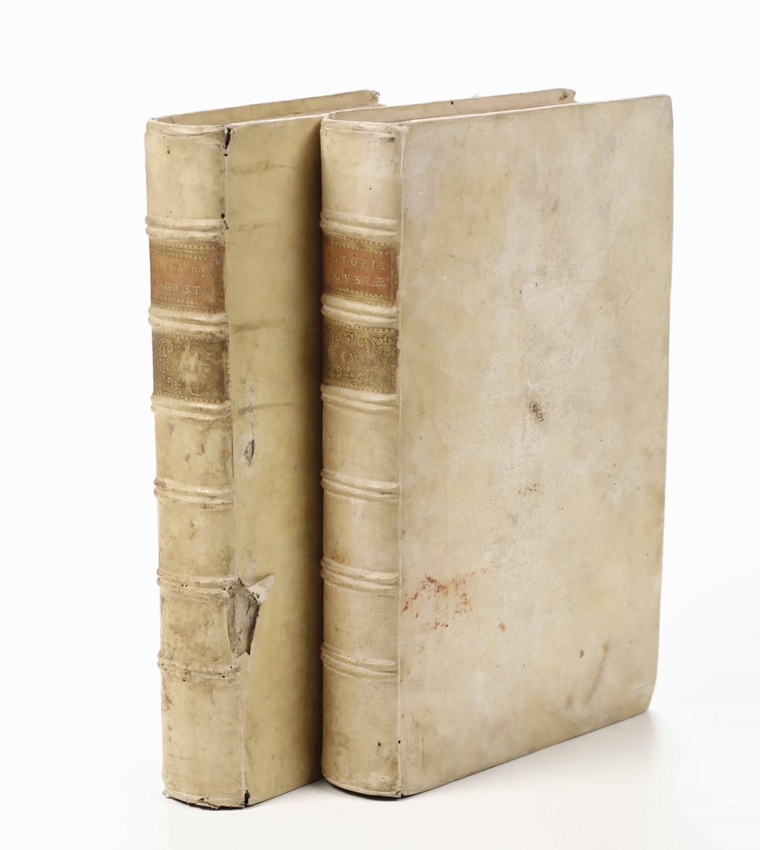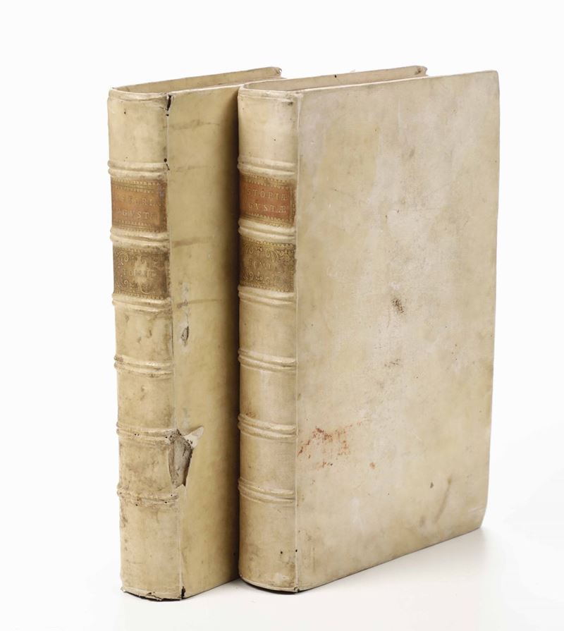 In-folio. Due volumi. Legature in pergamene del secolo XVIII. Bruniture e qualche galleria di tarlo.
