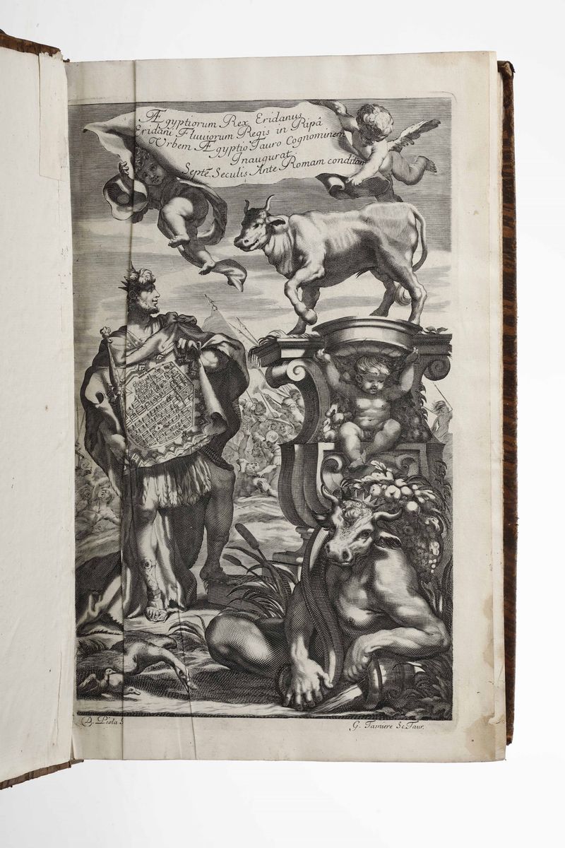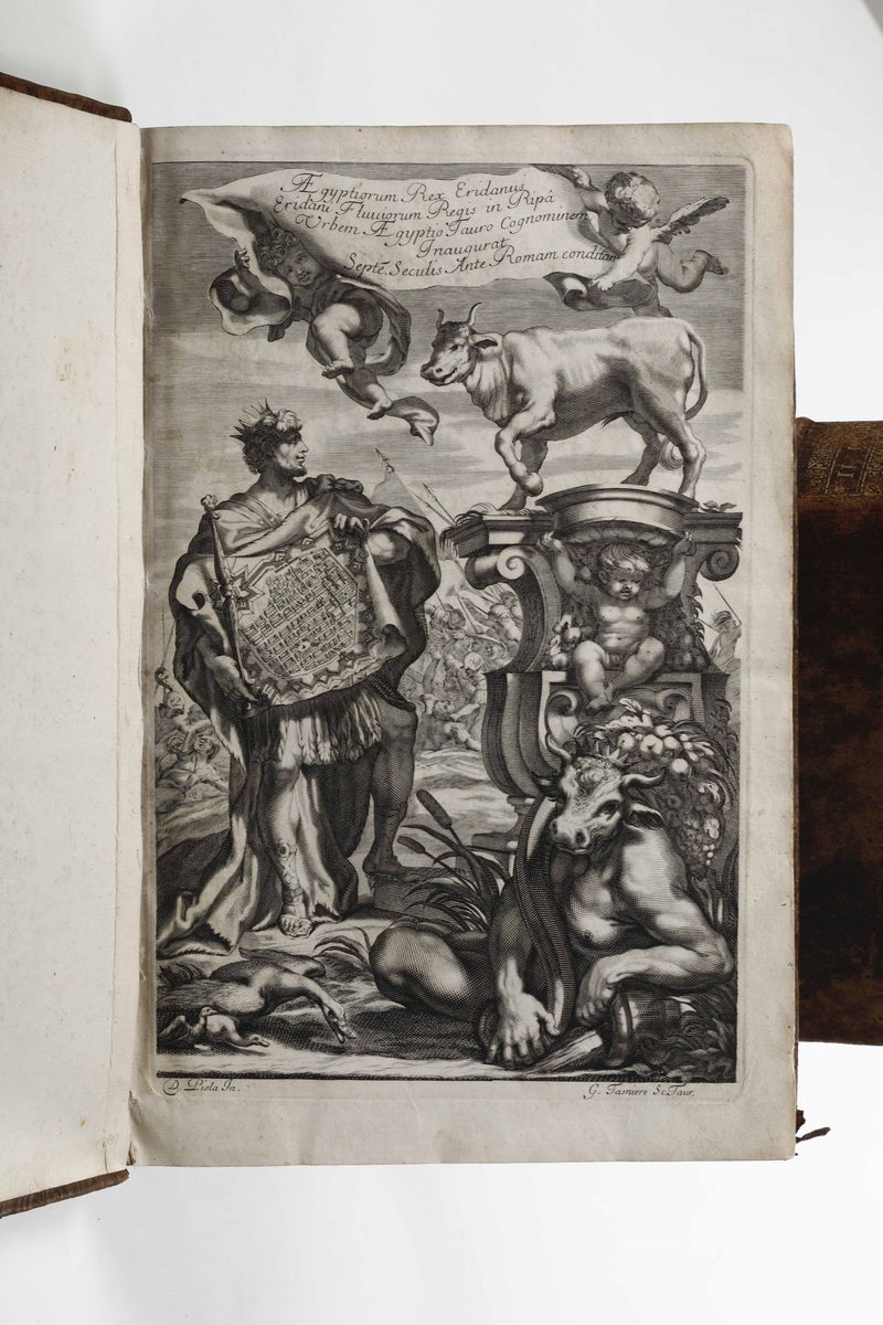 In-folio. Legature coeve in piena pelle con abrasioni e mancanze ai dorsi. Ex libris a timbro al contropiatto anteriore. Due antiporte incise dal Tasniere.