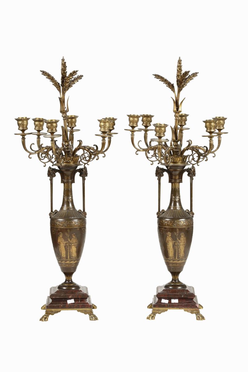 Coppia di candelabri. Bronzo dorato e patinato. Basi in marmo rosso. XIX secolo