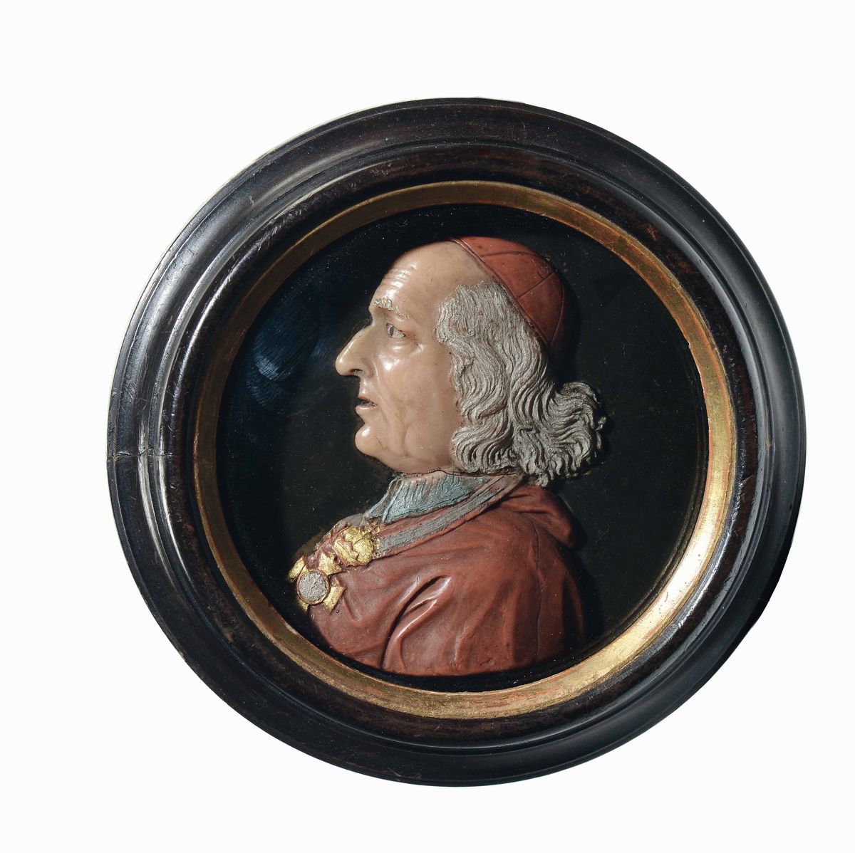Rispetto all’incisione il nostro medaglione in cera presenta alcune diversità: il Cardinale non porta infatti la corta parrucca che si vede sulla stampa, la veste appare più dettagliata e l’ordine cavalleresco è aggiunto dal ceroplasta. Inoltre il profilo appare invertito. Questa ceroplastica, di notevole qualità, rende con grande verismo il carattere umano e psicologico di colui che fu considerato uno dei grandi ingegni dell’Urbe.