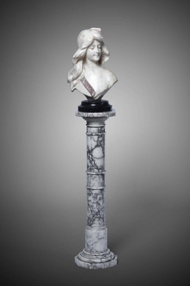 Busto femminile in marmo bianco parzialmente dipinto. XX secolo