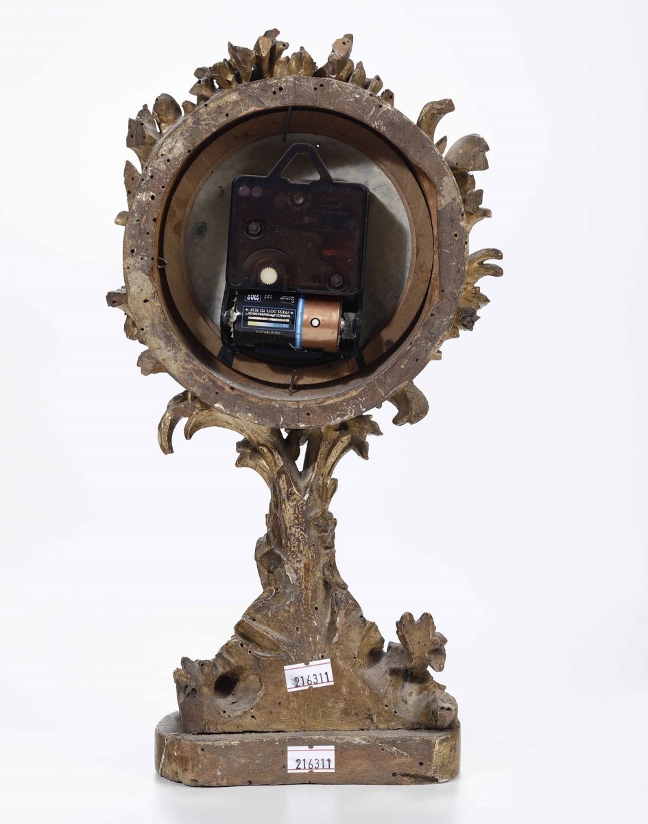 Cassa di orologio in legno intagliato e dorato, XVIII secolo