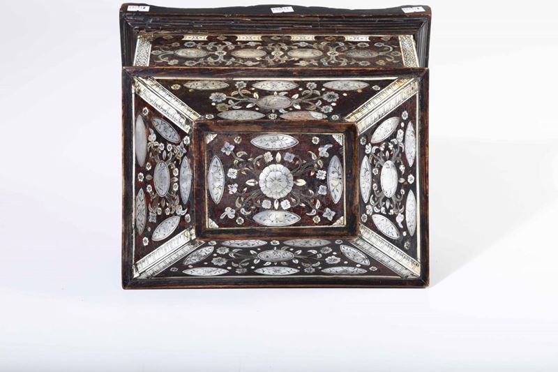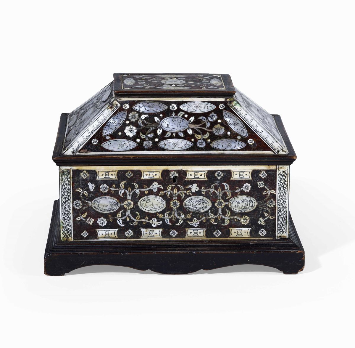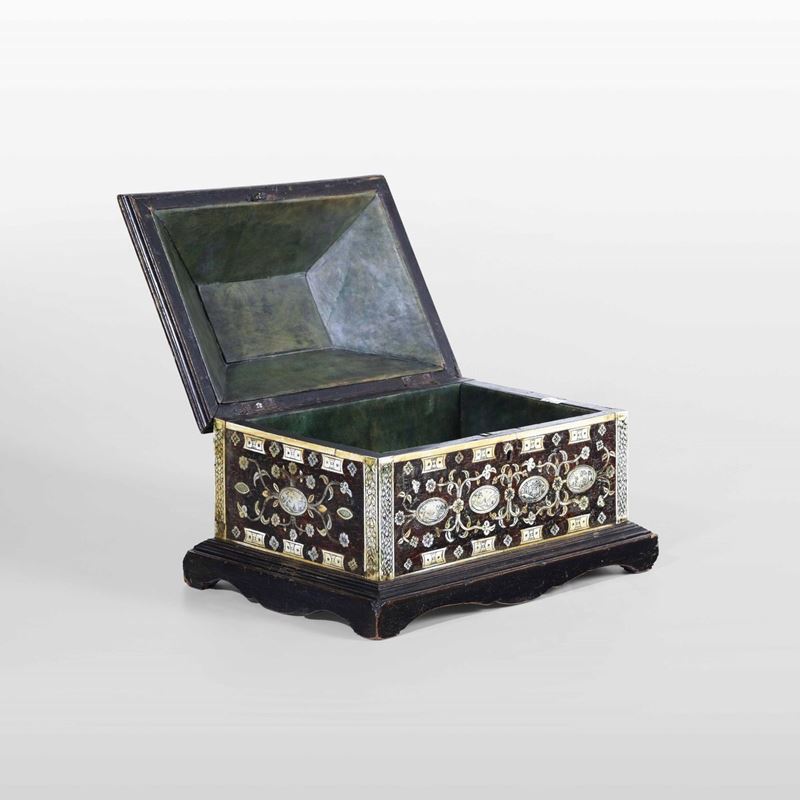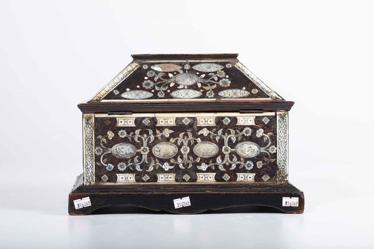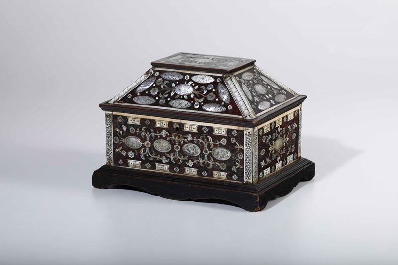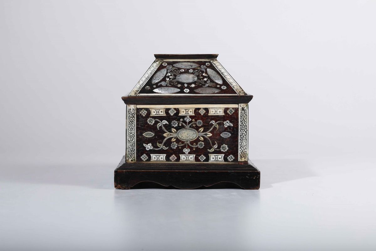 Cofanetto in Jaracanda. Avorio e madreperla incisa. Arte coloniale, XVII secolo