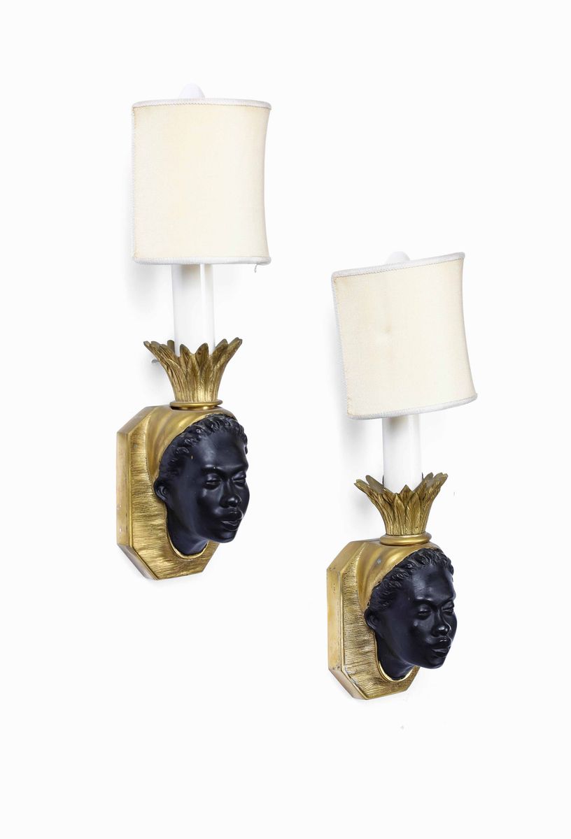Coppia di appliques in bronzo dorato e patinato con testa di moro. XIX-XX secolo