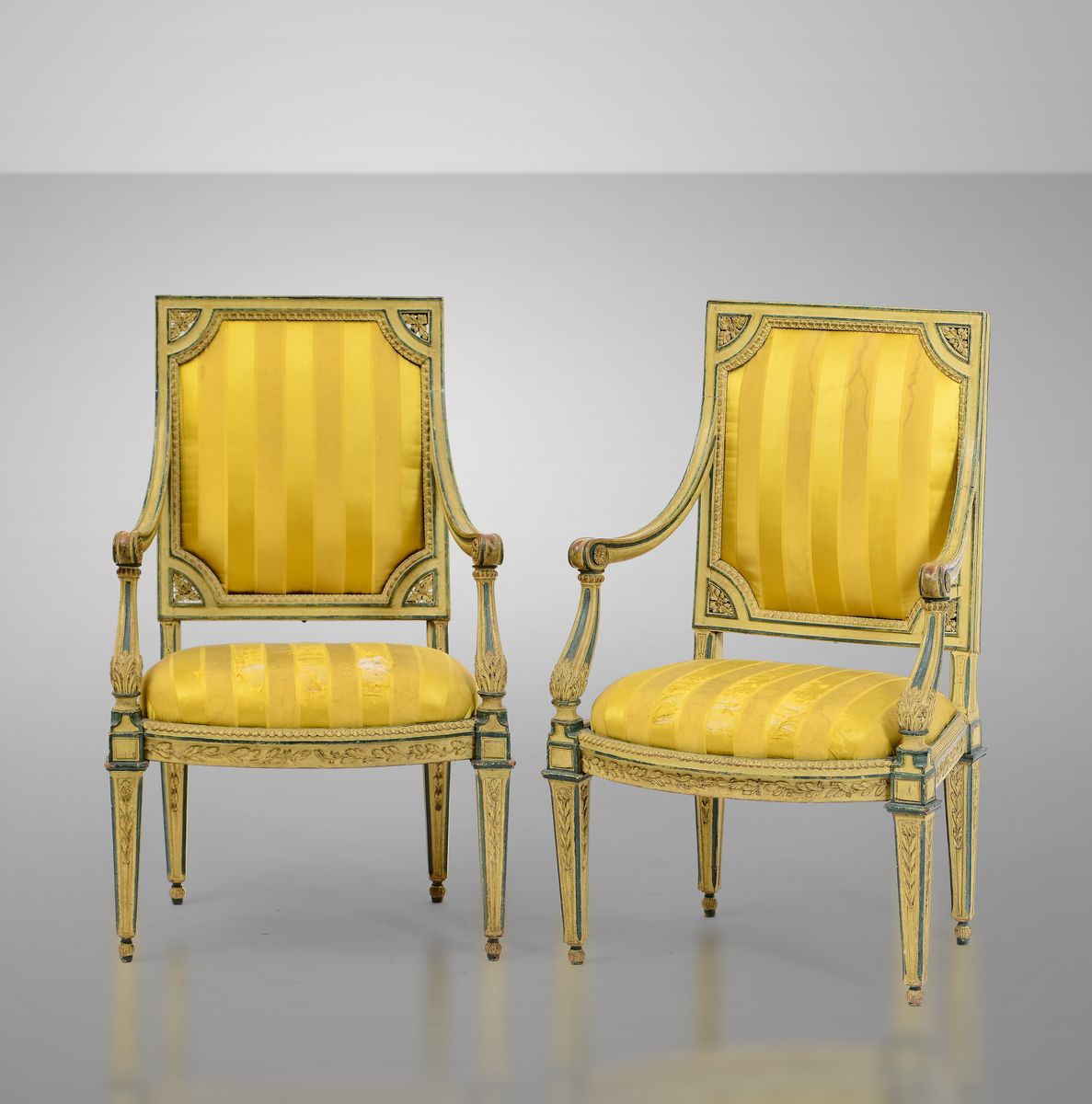 Coppia di poltrone in legno intagliato e laccato, seconda metà XVIII secolo