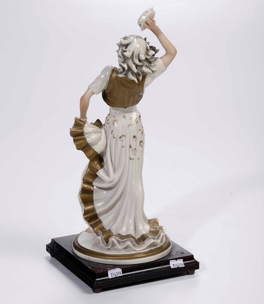 Scultura in porcellana policroma raffigura una ballerina gitana con tamburello