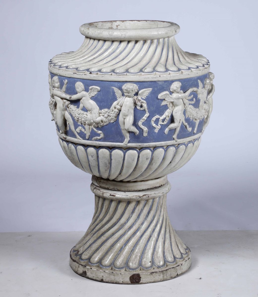 Maiolica smaltata. Dimensioni: altezza cm 100; diametro massimo cm 65. Conservazione: staccato netto, in due pezzi, inferiormente tra la fascia con i putti e la fascia con le baccellature; minime sbeccature e cadute di smalto