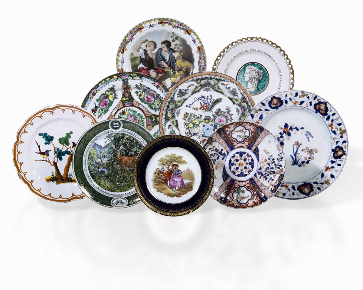 Lotto di nove piatti in porcellana, diverse manifatture, XVIII, XIX e XX secolo