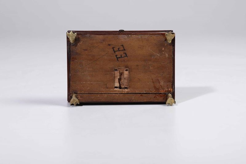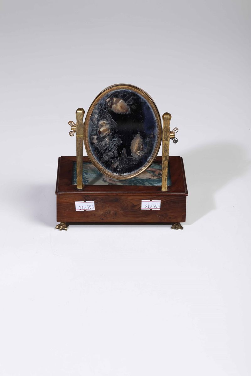 Piccola scatola in legno con specchietto in bronzo dorato e cesellato. XIX-XX secolo