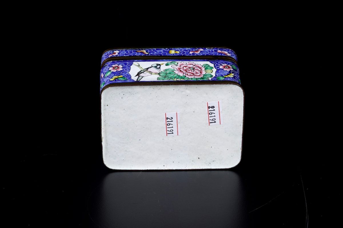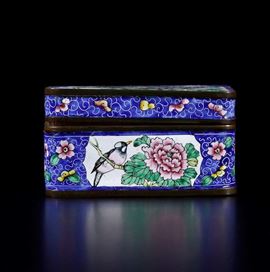 Scatolina in smalti a motivi floreali e uccellini tra i rami entro riserve, Cina, XX secolo