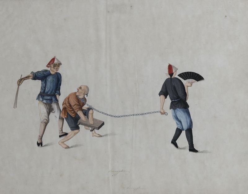Serie di cinque acquerelli su carta di riso raffiguranti scene di vita orientale, Cina, Dinastia Qing, XIX secolo