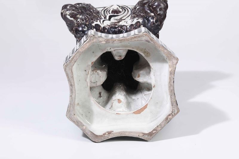 Maiolica. Marca: assente. Altezza cm 45; cm 30x32. Conservazione: qualche sbeccatura. Copertura superiore con lastra in ardesia