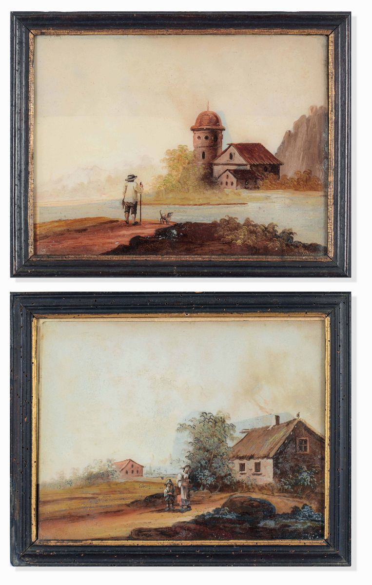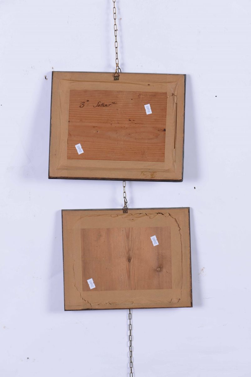 coppia di dipinti su vetro, cm 20x25