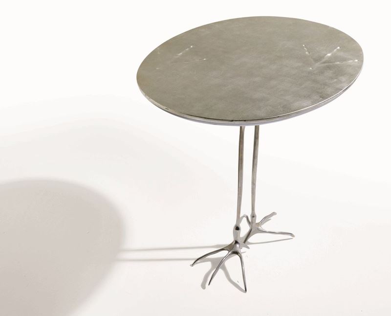 Tavolo mod. Traccia struttura in fusione di bronzo argentato e piano in legno foglia argento. Collezione Ultramobile. Marchio originale.