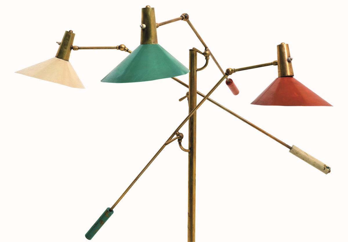 Lampada da terra con bracci regolabili e orientabili. Struttura in ottone e diffusori in alluminio laccato.