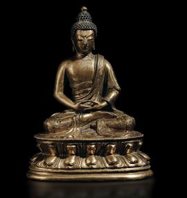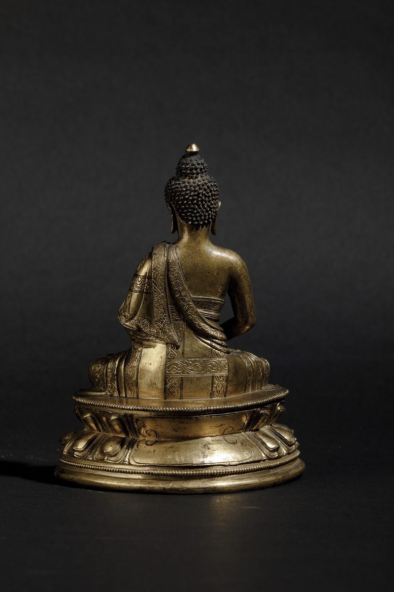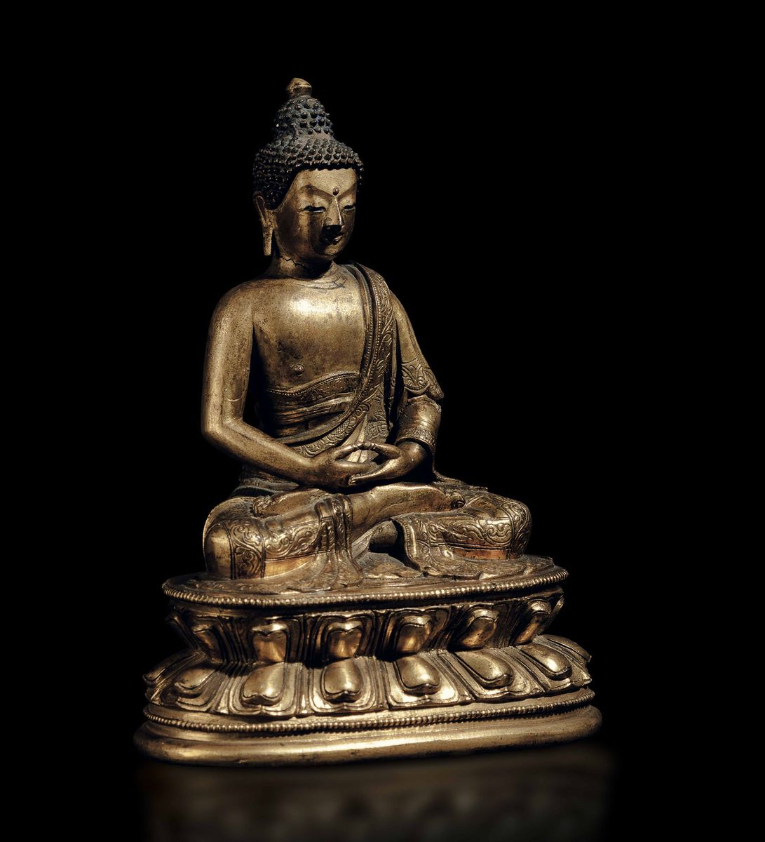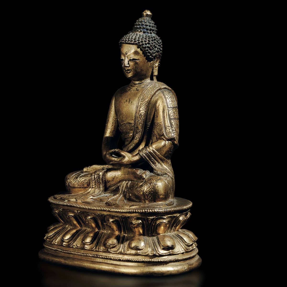 Figura di Buddha Amitayus in bronzo dorato seduto su doppio fiore di loto, Cina, Dinastia Qing, XVII secolo