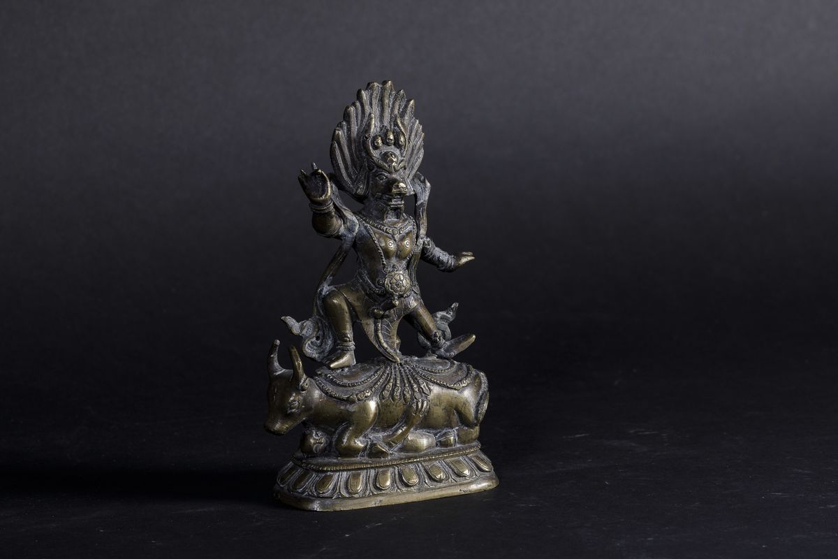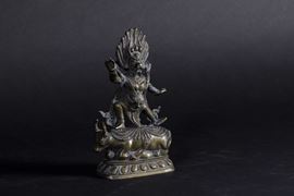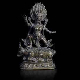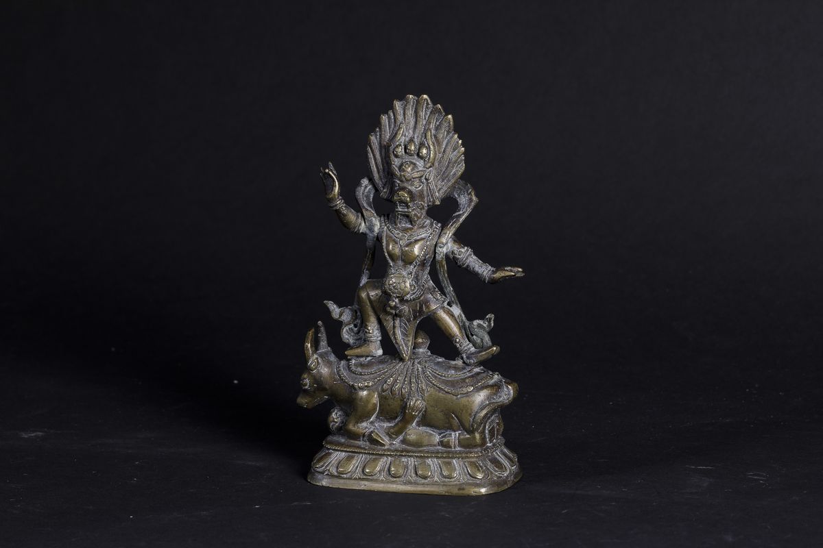 Figura di Dharmapala Santi-Yama in bronzo stante su fiore di loto, Tibet, XIX secolo