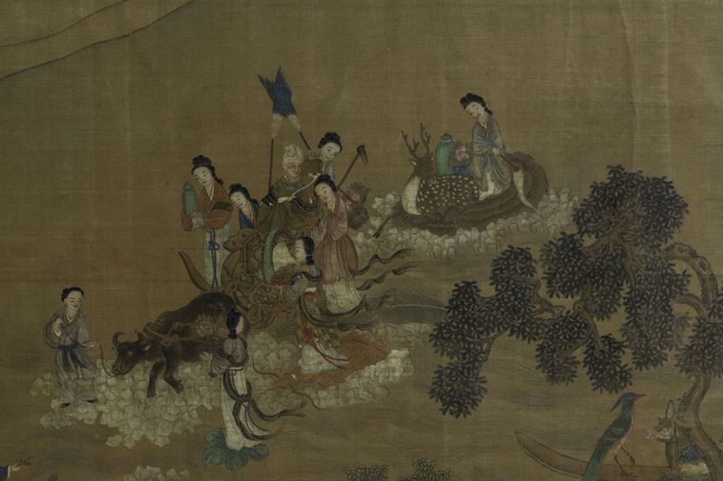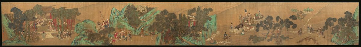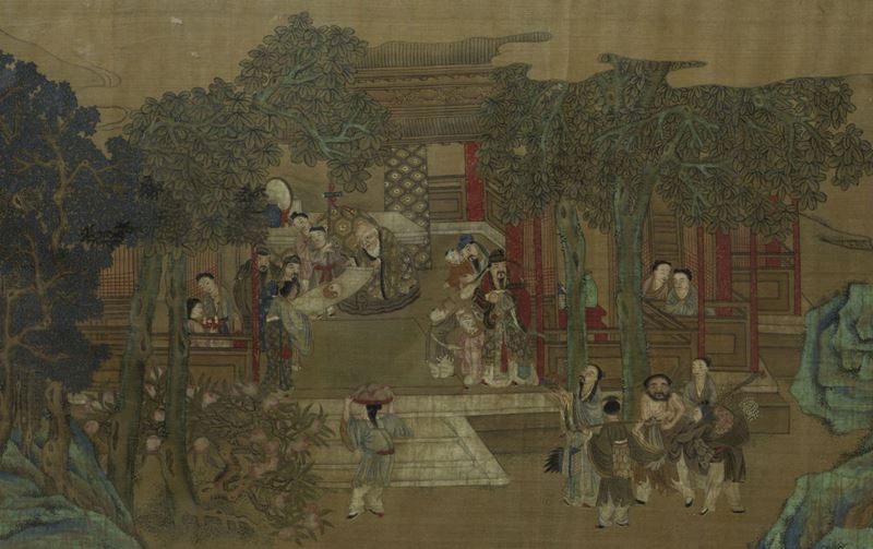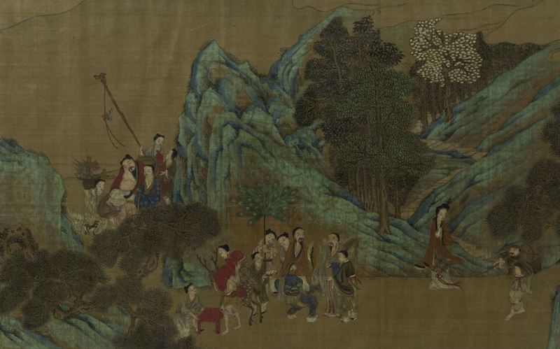 Grande dipinto su carta raffigurante scene di vita comune entro paesaggio, Cina, inizio XIX secolo