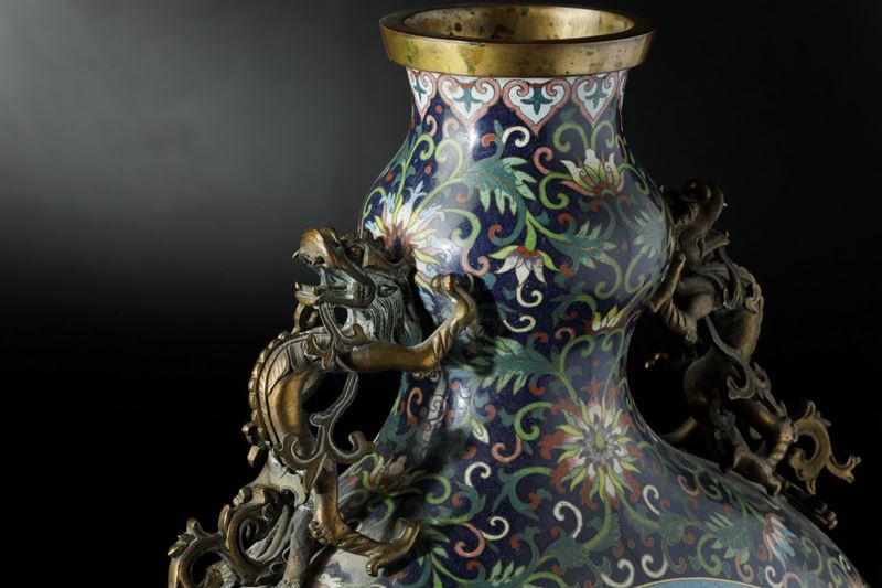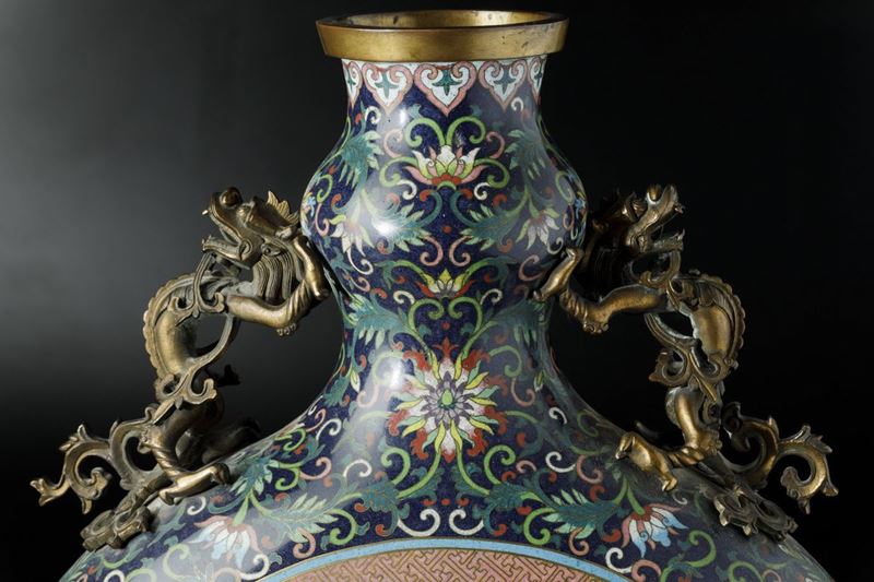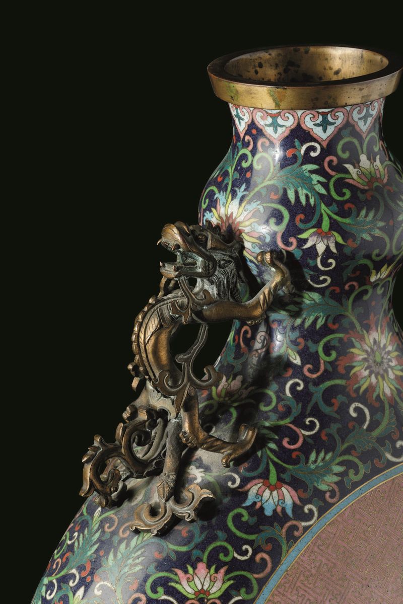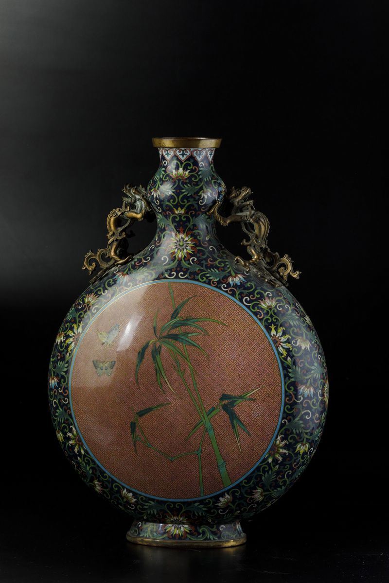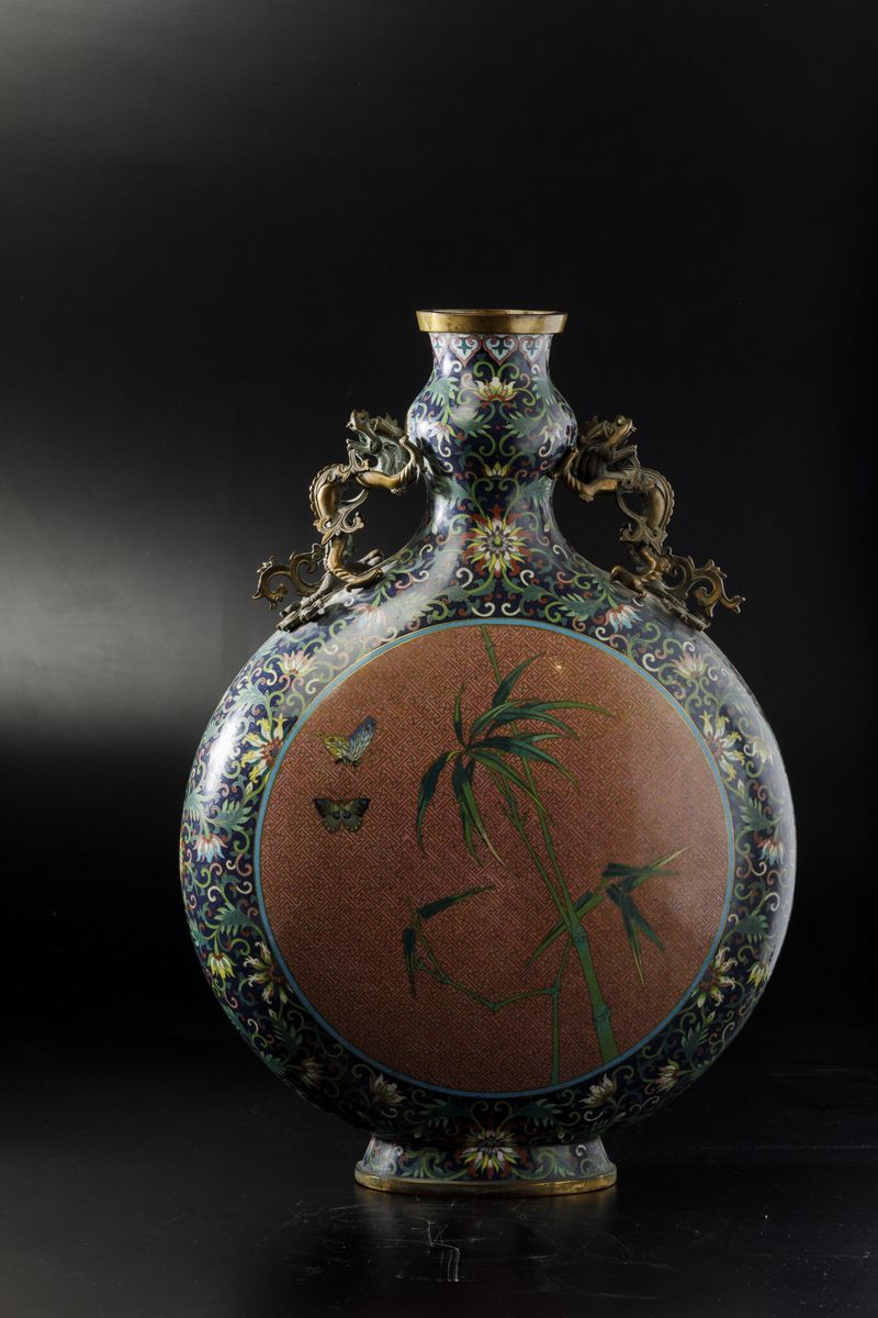 Grande fiasca a smalti cloisonnè con soggetti naturalisti entro riserve centrali, decori floreali e anse a foggia di draghetto, [..]